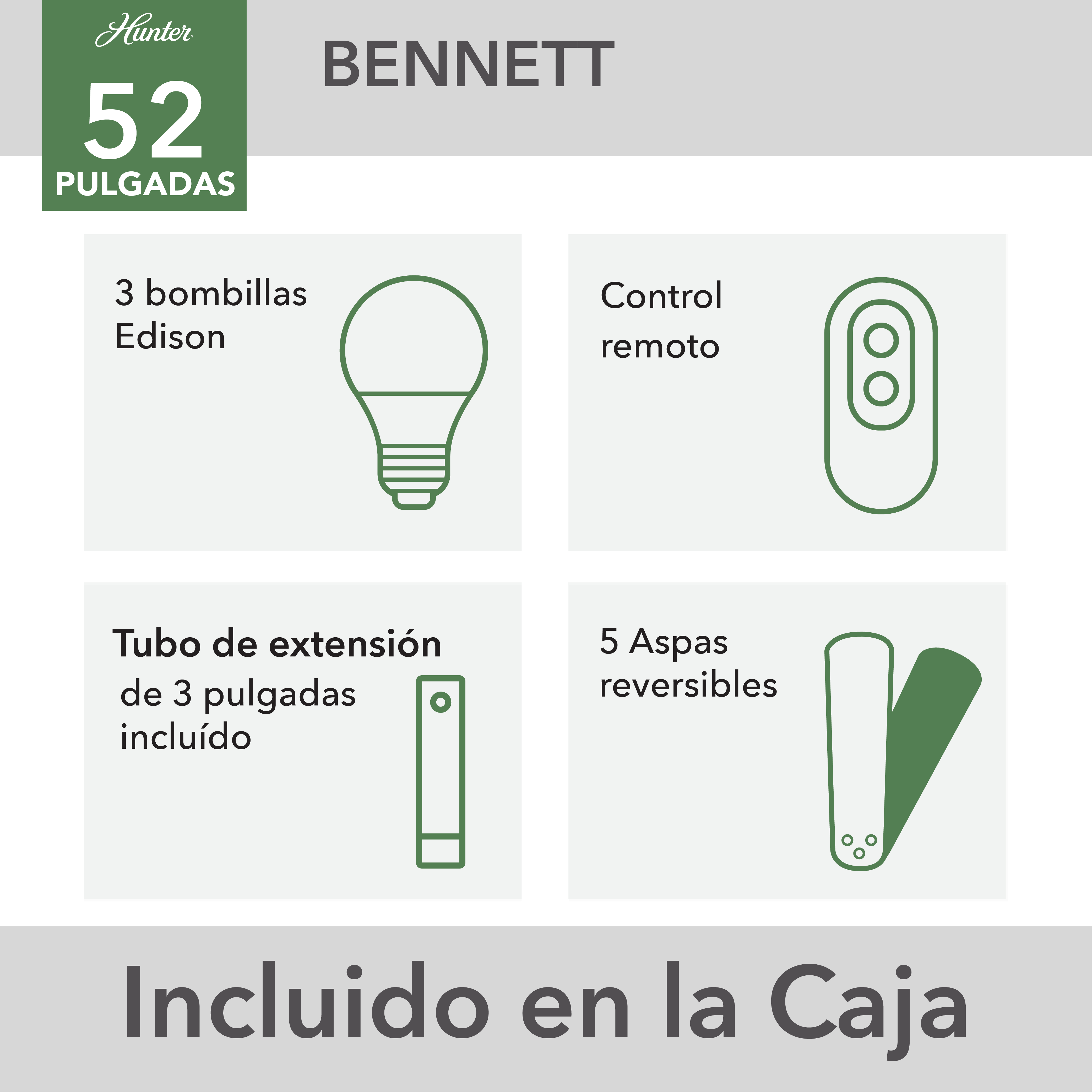 Considerado como uno de nuestros mejores ventiladores de techo tanto por diseñadores como por propietarios, el aspecto clásico renovado de un ventilador de techo Bennett agregará estilo a sus espacios de vida tradicionales. El cristal lateral ahumado pero transparente con múltiples luces completa la armoniosa paleta de colores de este ventilador y añade un toque de glamour. Los focos LED Edison de bajo consumo mejoran el ambiente de su habitación, mientras que un potente motor WhisperWind® hará que sus espacios formales y elegantes sean tan funcionales como elegantes.