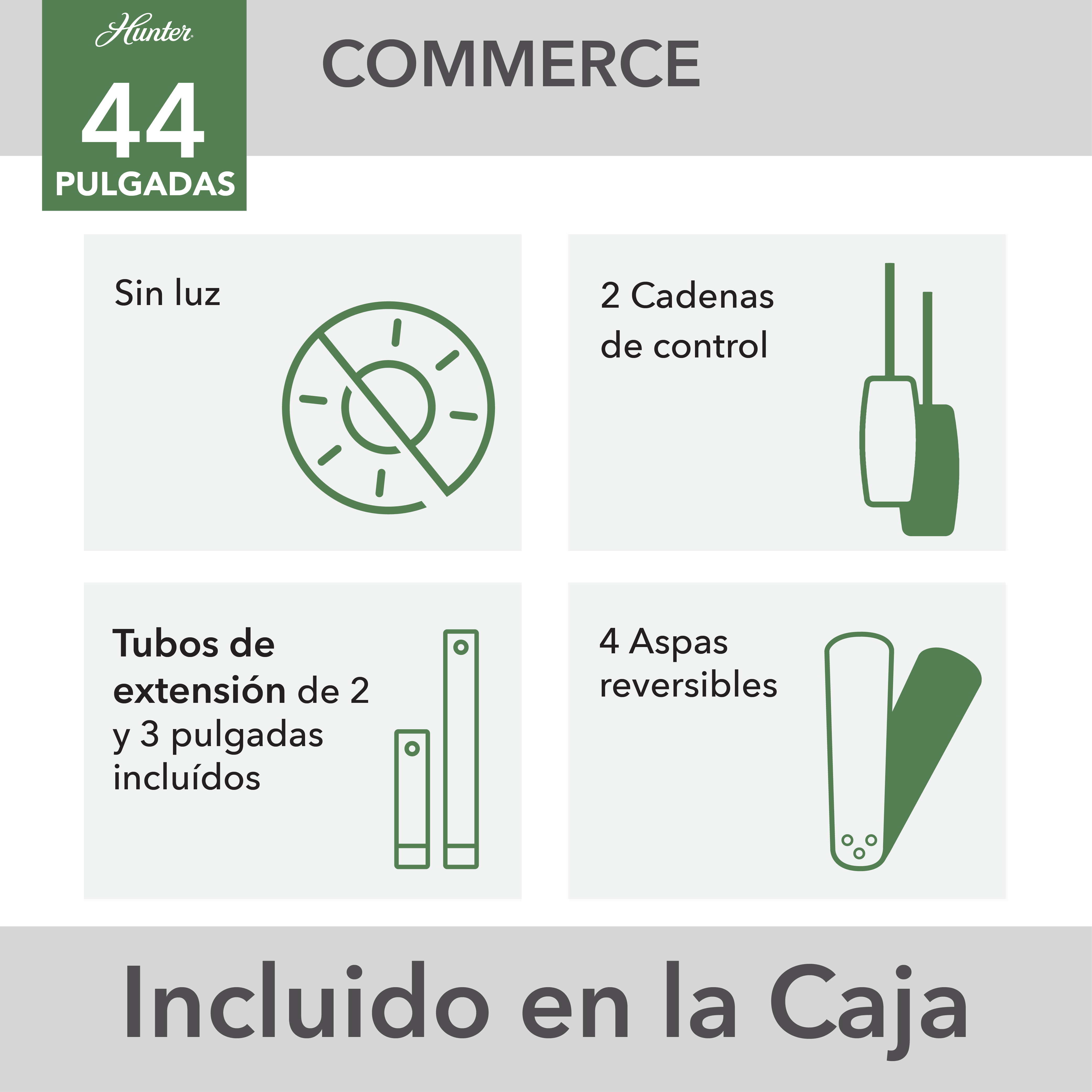 El ventilador de estilo industrial Commerce cuenta con un motor expuesto y un diseño simple y angular con líneas limpias que lo hacen perfecto para la decoración minimalista de su hogar. Una gran adición a cualquier habitación grande o espacio cubierto expuesto a la humedad, este ventilador resistente a la humedad cuenta con herrajes de acero inoxidable para resistir los elementos. Las luces LED de bajo consumo brindan el ambiente perfecto y el motor WhisperWind® reversible de tres velocidades ofrece un movimiento de aire ultrapotente con un rendimiento silencioso.