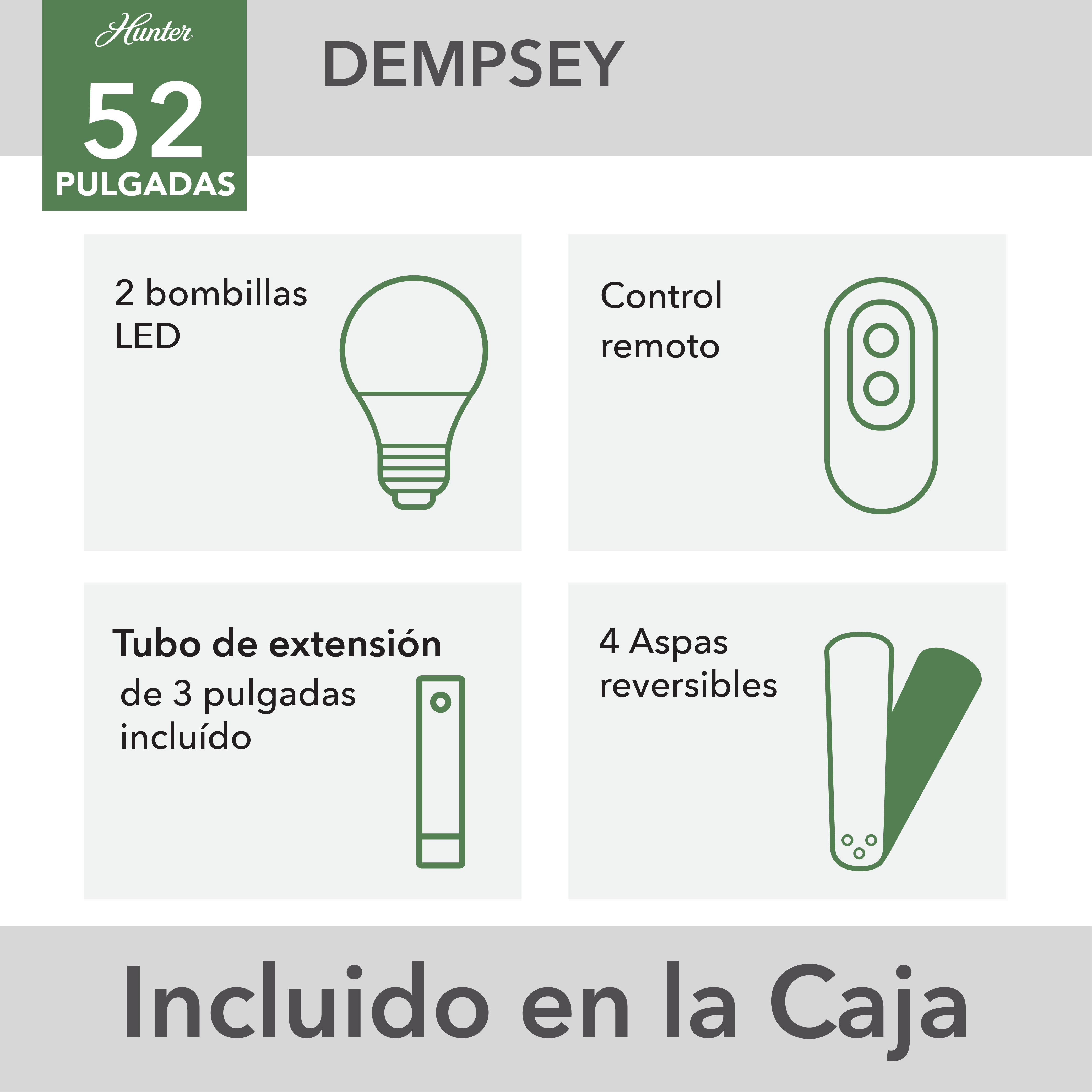 Un ventilador contemporáneo con un atractivo masivo, el Dempsey encajará perfectamente en el diseño interior moderno de su hogar. Las hermosas y limpias opciones de acabado se combinan con el alto contraste de ángulos en todo el diseño para crear una apariencia que mantendrá su espacio con un aspecto actual e inspirado. Este ventilador tiene clasificación de humedad para porches cubiertos o cualquier área con humedad. Los focos LED totalmente regulables y de bajo consumo le brindan un control total sobre la iluminación, mientras que la extensión de las aspas de 52 pulgadas es ideal para habitaciones grandes. Tenemos una colección completa de ventiladores Dempsey para que pueda mantener una apariencia consistente mientras adapta el tamaño y las características a cada habitación de su casa.